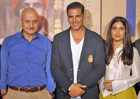 | From left: Anupam Kher, Akshay Kumar and Bhumi Pednekar at the press conference of their upcoming Hindi film Toilet: Ek Prem Katha, on July 27, 2017. |